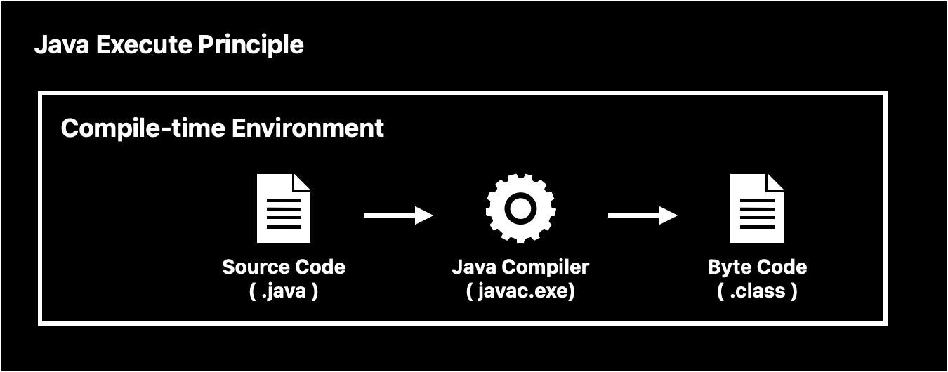 JVM, JRE, JDK와 같은 기본적인 용어를 설명하고 간단한 컴파일러의 동작 과정을 보면서 소스 코드(.java)가 Java Compiler(javac)에 의해 바이트 코드(.class)로 변하는 컴파일 시점의 환경을 살펴보았다.