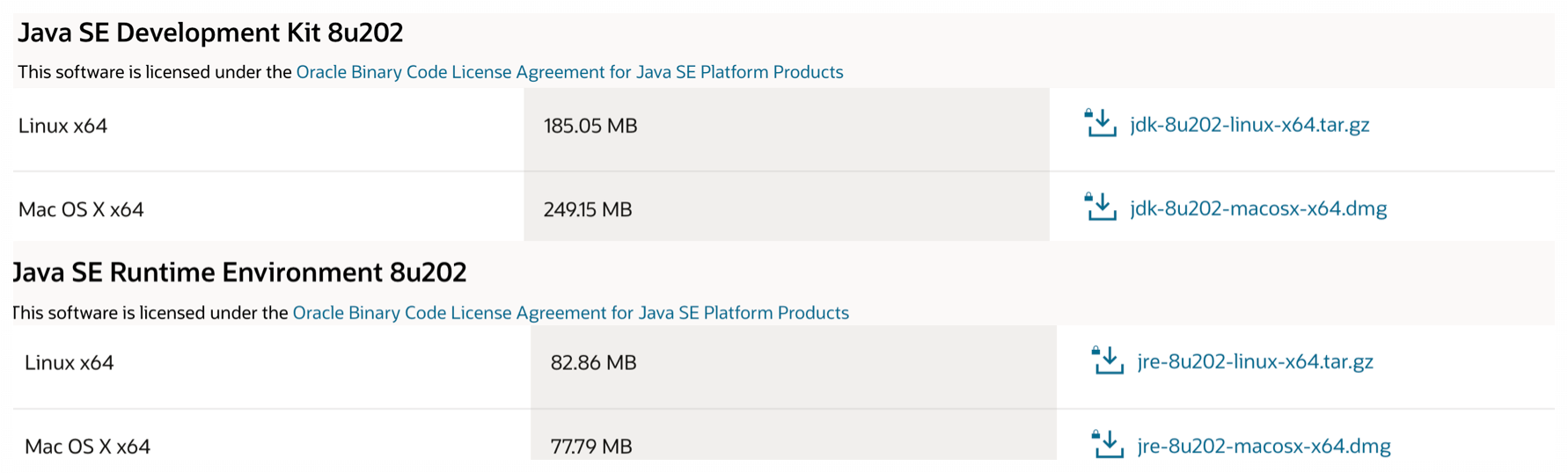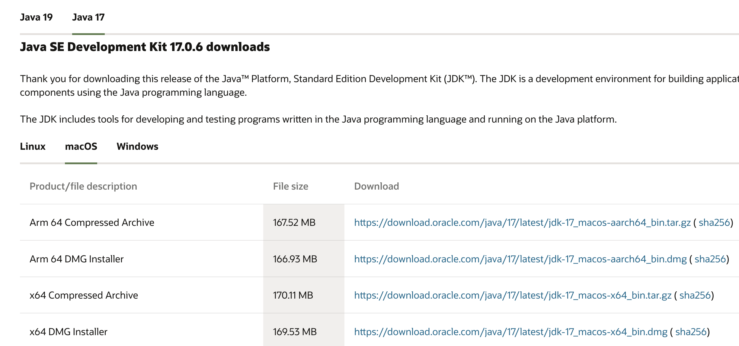 이렇게 변환된 Byte Code는 클래스 로더에 의하여 JVM의 메모리에 로드되고 연결하는 과정을 거친다. 이 과정이 왜 Java는 한 번 작성, 어디서나 실행된다는 말일까? 분명히 Oracle JDK 다운로드 홈페이지를 보면 아래와 같이 Linux, macOS, Windows로 운영체제마다 다르게 다운받는 것을 볼 수 있다.