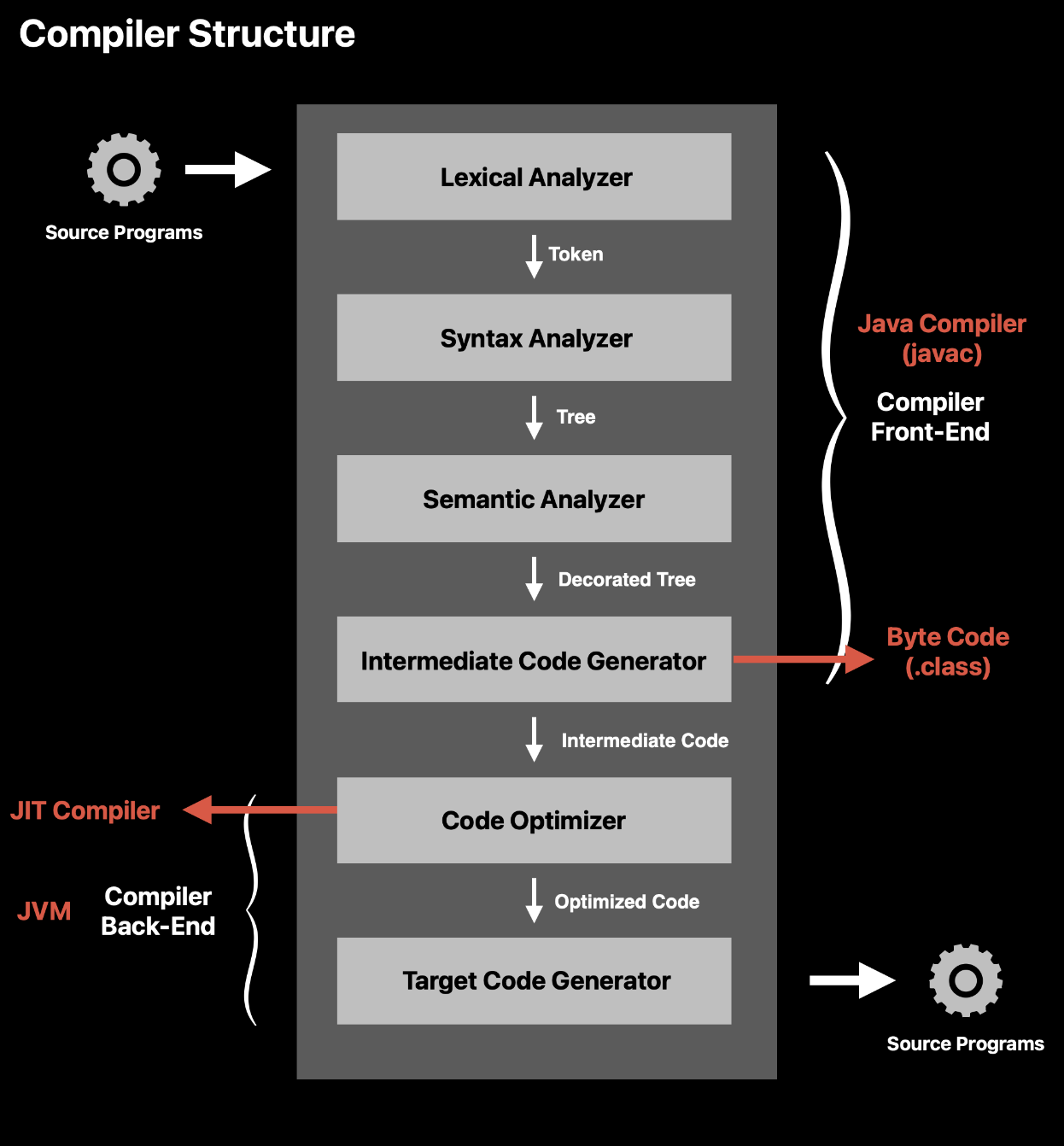 위에서 자바 컴파일러에 의해 소스 코드(.java)가 바이트 코드(.class)로 변환된다고 했었다. 바로 Compiler Front-End 부분을 자바 컴파일러가 담당하는 것이다. 컴퓨터가 직접적으로 이해할 수는 없지만, 추상화 된 형태인 Byte Code가 생성되기 때문이다. Intermidate Code가 바로 Byte Code이다. ( 참고로, 기계어를 이루는 바이너리 코드와 바이트 코드는 다른 것이다. ) 이를 바탕으로 그림을 다시 그려보면 아래와 같다.