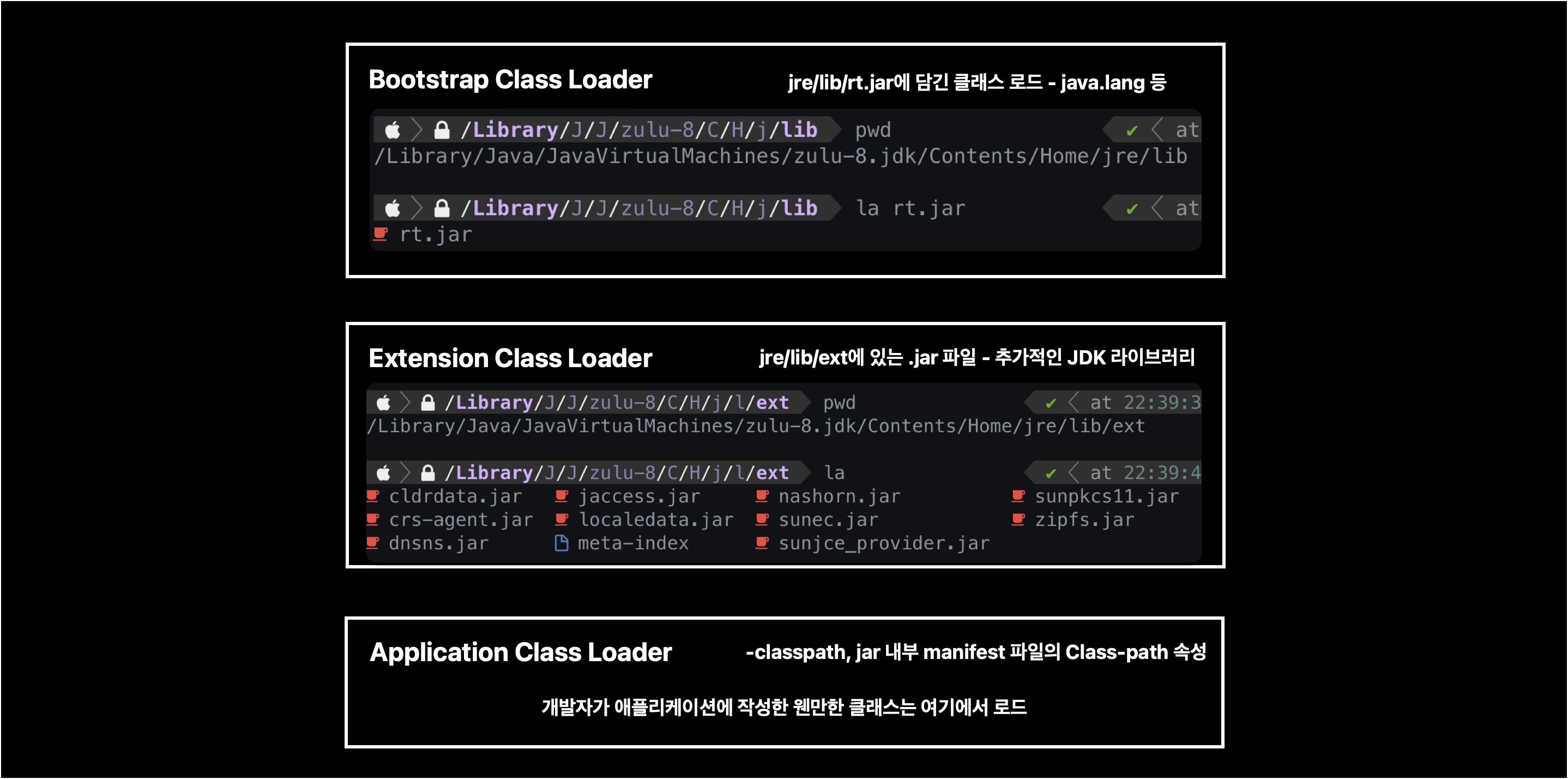 - Java 8에서는 모든 Java 플랫폼 API, Java 애플리케이션을 함께 패키징한 rt.jar 파일을 로드한다. (ex. java.lang )