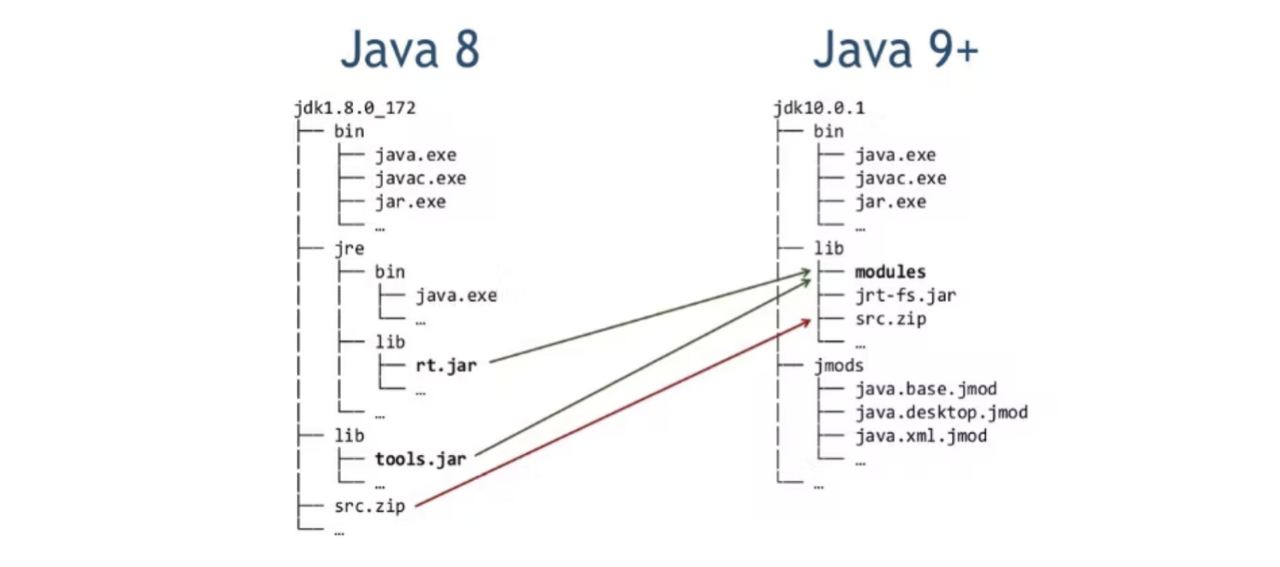- rt.jar과 tools.jar 안에 있던 내용들은 모듈 시스템에 맞게 더 효율적으로 재편되어 lib 디렉토리에 저장되었다.