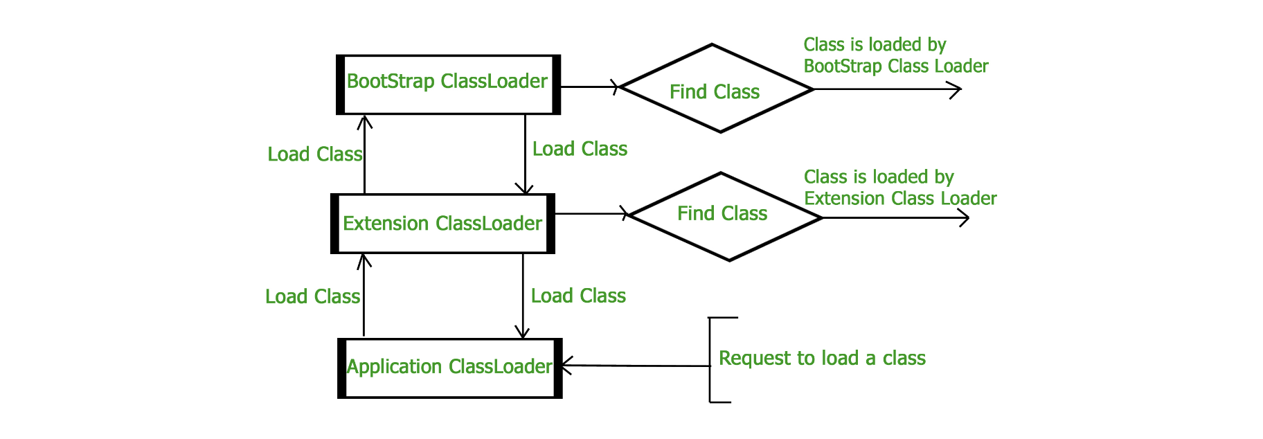 - 과정을 살펴보면, 개발자가 작성한 Main 클래스를 로딩하는 과정에서 Application ClassLoader → Extension ClassLoader → Bootstrap ClassLoader로 loadClass() 메서드를 위임하고 상위 계층의 클래스로더에서 loadClass() 메서드로 클래스를 찾지 못하면 하위 계층으로 내려간다.