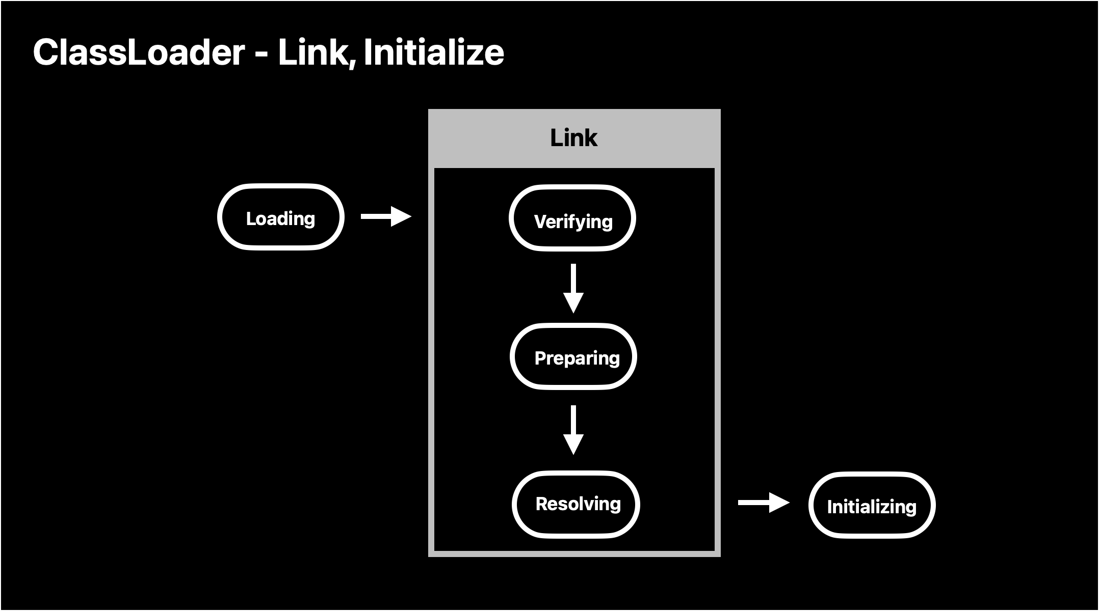 Load 단계에서 Byte Code(.class) 파일을 가져와서 JVM의 메모리에 로드하고 난 이후, Link 단계에서는 Byte Code(.class) 파일 내의 symbolic references를 실제 메모리 주소로 변환하는 작업을 수행한다.