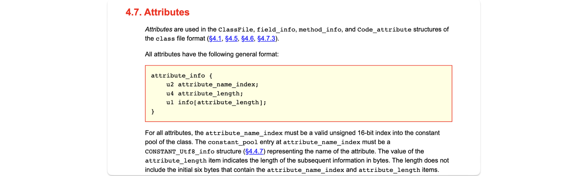 자바 class 파일은 oracle docs 4.7에서와 같은 구조를 가지는데, 이 구조의 contant_pool_count, constant_pool[]이 흔히 말하는 Constant Pool(상수 풀)을 의미한다. 이때, 특정 상수에 대한 모든 인덱스 또는 참조를 16비트(type u2) 번호로 제공되며, 여기서 인덱스 값 1은 표의 첫 번째 상수를 나타낸다. 그러면, 클래스 파일을 역어셈블러(javap)를 이용하여 살펴보겠다.
