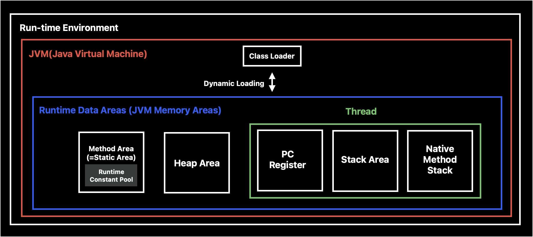 Runtime Data Areas는 JVM이 Host Operating Systems 위에서 실행되면서 OS로부터 할당받는 메모리 영역이다. 그림을 보면 Thread로 묶이는 부분과 묶이지 않는 부분을 볼 수 있는데, 이는 공유하는 것과 아닌 것의 차이이다. PC Register, Stack Area, Native Method Stack은 스레드가 생성될 때마다 생성되는 영역이고 Method Area, Heap Area는 JVM이 시작될 때 단 1개씩만 생성된다. Method Area와 Heap Area는 모든 스레드가 공유한다는 의미이다.