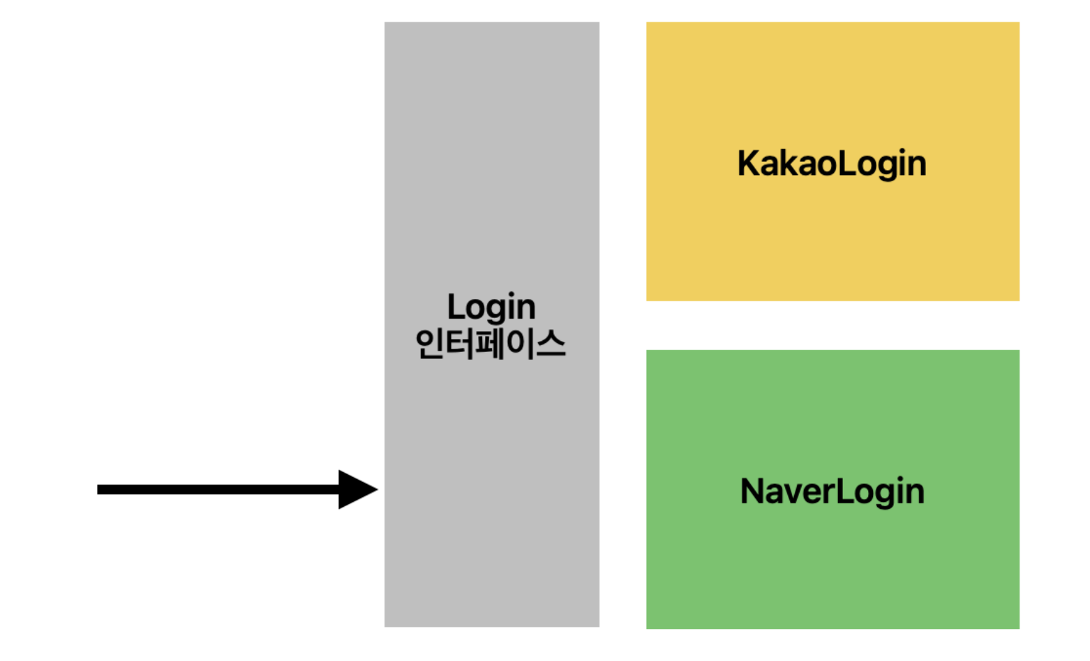 구상체인 카카오 로그인이나 네이버 로그인으로 표현하지 않고 추상체인 로그인 인터페이스로 표현하면서, 접근하는 사람에 따라 필터링 된 기능만 제공하는 형식이 가능하다.