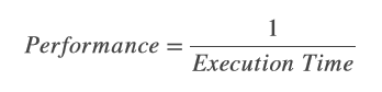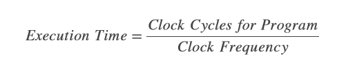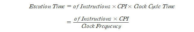 CPU execution time은 특정한 작업을 할 때 CPU가 소요한 시간을 의미하고 Wall-clock time과는 다르게 불필요한 작업을 배제해서 우리가 원하는 특정 작업에 대한 성능 평가를 정확하게 수행할 수 있다. CPU 성능은 실행시간과 밀접한 연관이 있다. 실행시간이 짧다는 것이 성능이 좋다는 것이므로 아래와 같은 식이 나온다.