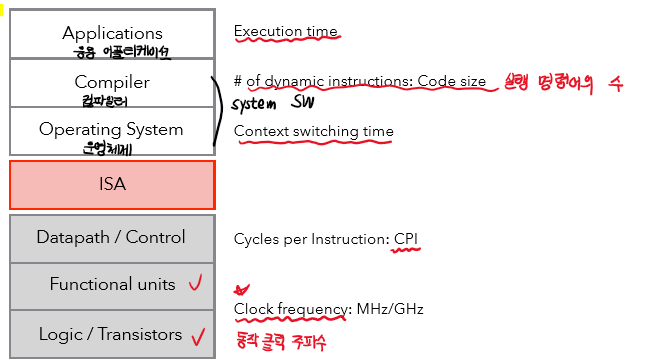 아래의 하드웨어 영역에서 위의 소프트웨어 영역까지 여러 가지 지표가 있는데 ISA를 설명하기 이전이기 때문에 하드웨어부분의 지표에 관하여 먼저 설명한다. 여기 나온 지표들은 보통 시간과 관련이 있다. 시간이 짧게 소요되면 더 빠르게 실행할 수 있고 성능이 좋다는 것으로 이해한다.