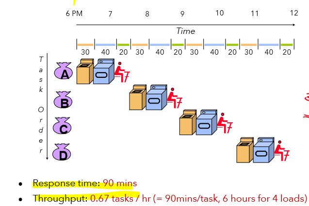 Response time과 Throughput을 알아볼 때 순차적인 처리 방법 Sequential과 공장에서 찍어내는 듯한 Pipelined 방법이 있다. 순차적으로 일을 처리하면 놀고 있는 자원이 생겨서 throughput이 낮아진다. 놀고 있는 자원이 발생하지 않게 Pipelined 방식으로 하면 총 시간이 단축되면서 throughput이 높아진다.