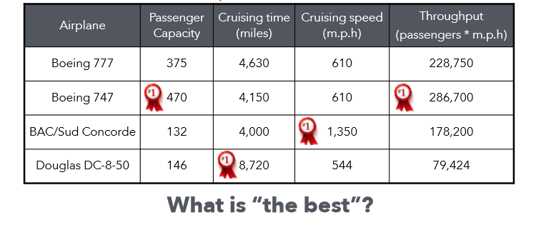 항공기의 예시로, 승객 수용량에 따라, 비행 시간에 따라, 속도에 따라, throughput에 따라, 여러 기준에 따라 성능이 최고인 것이 판가름 나는 것과 동일하게 컴퓨터의 성능 또한 마찬가지이다. 컴퓨터의 경우 프로세서 성능이 뛰어난 것을 기준으로 잡는지 혹은 메모리 크기를 기준으로 잡는지각기 다르게 성능을 평가할 수 있다. 무조건 최고로 하면 되지 않느냐고 물어볼 수 있지만, 가격과 성능을 생각한 절충안을 고려해야 한다.