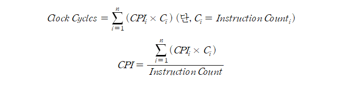 성능을 증가시키려면 클록 주파수를 늘려서 ( 클록 사이클 시간을 줄여서 ) 하는 방법이 있고 CPI 수를 줄이는 ( 명령어 수를 줄이는 ) 방법이 있다. 그래서 아래와 같은 식이 나온다.